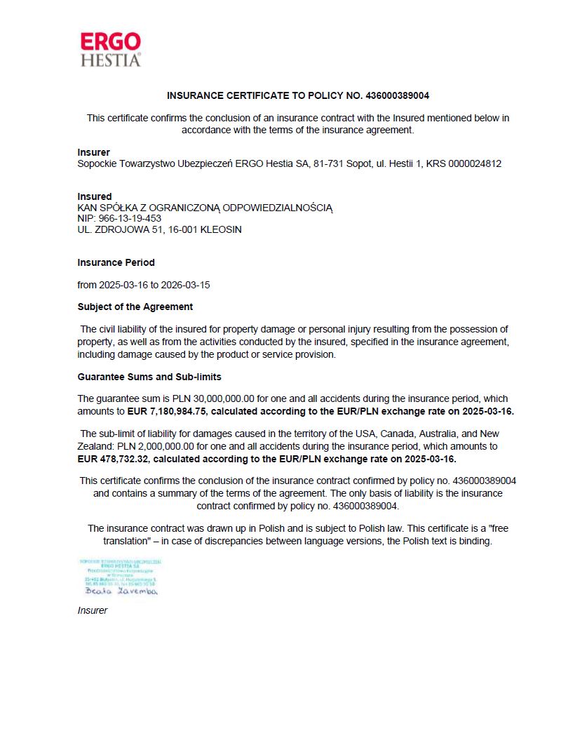 Η εταιρεία KAN Co. είναι ασφαλισμένη για το ποσό των 6.395.361 ευρώ για να καλύψει όλες τις δυνητικές απαιτήσεις των πελατών, οι οποίες μπορεί να προκύψουν από τις διατάξεις της εγγύησης.